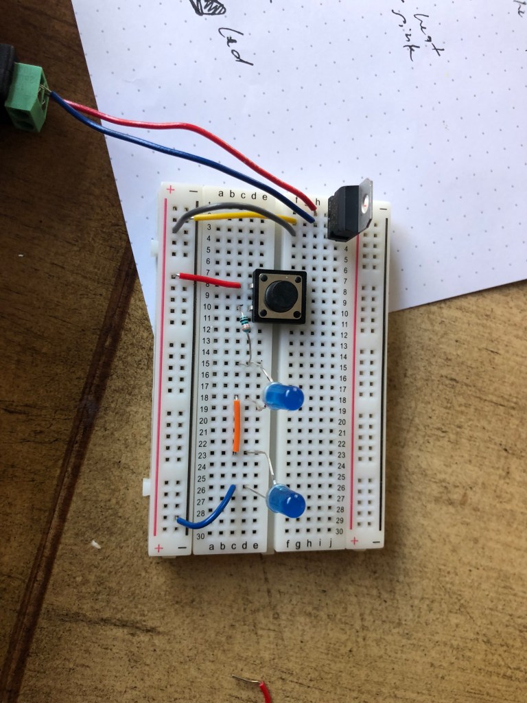 For my DIY switch I made a copper pinch switch you use by pinching together the copper tape pieces to complete the circuit. I made this by making a break in the PWR line and then putting pieces of copper tape on each end. When you put the two pieces of copper tape together power is able to travel through since copper is a conductor.